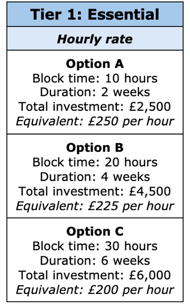Option A: 10-hour block valid for 2 weeks rated at £2,500 total, equivalent to £250 per hour