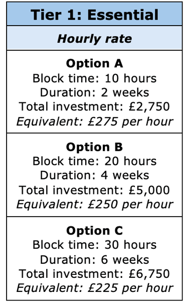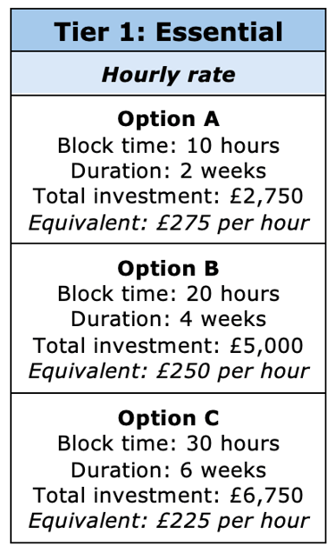 Option A: 10-hour block valid for 2 weeks rated at £2,750 total, equivalent to £275 per hour