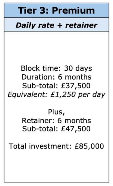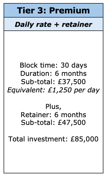 30-day block valid for 6 months rated at £37,500 total, equivalent to £1,250 per day, plus 6 months retainer at £47,500