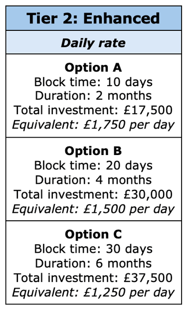 Hourly rates applicable to Tier 1: Essential are are ideal for focused advisory work, technical reviews and short‑duration tasks, while daily rates applicable to Tier 2: Enhanced and Tier 3: Premium provide predictable budgeting for longer-term, multi‑phase projects and organisational transformation.